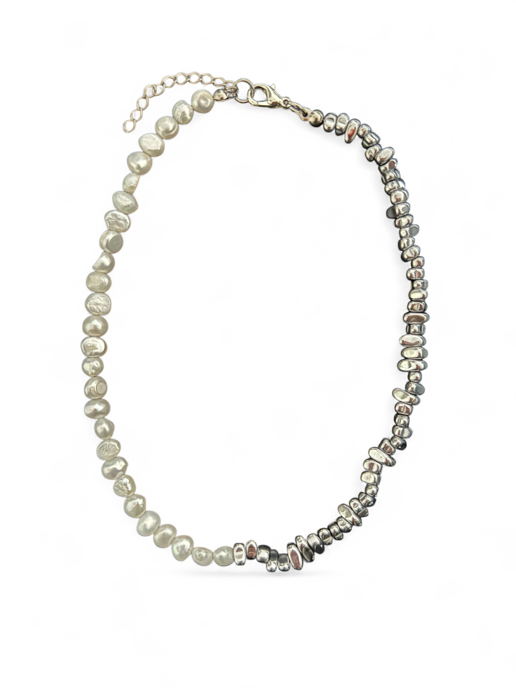 Materiais: Cascalho de Hematita Prata e Pérola de Água Doce