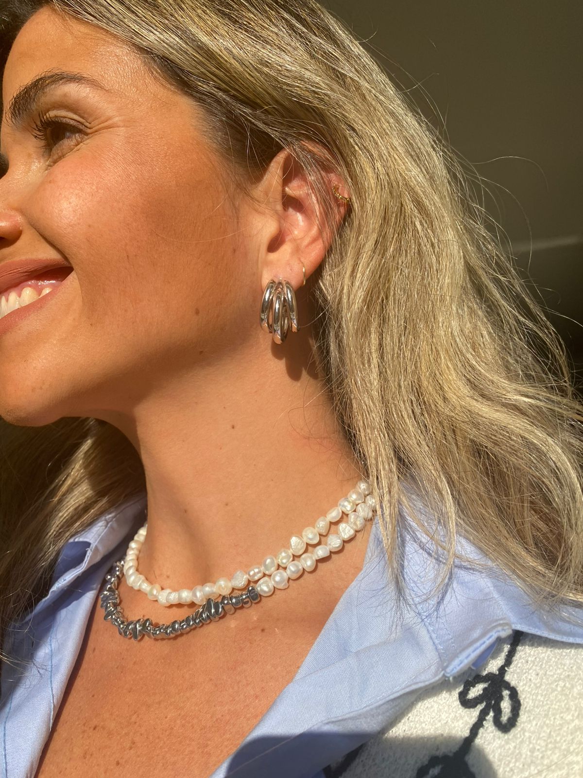 O colar dueto é puro charme. Metade de cascalho de hematita prata e metade pérola de água doce. Ele combina com qualquer look e vai bem e todas as ocasiões. O queridinho pra chamar de seu!