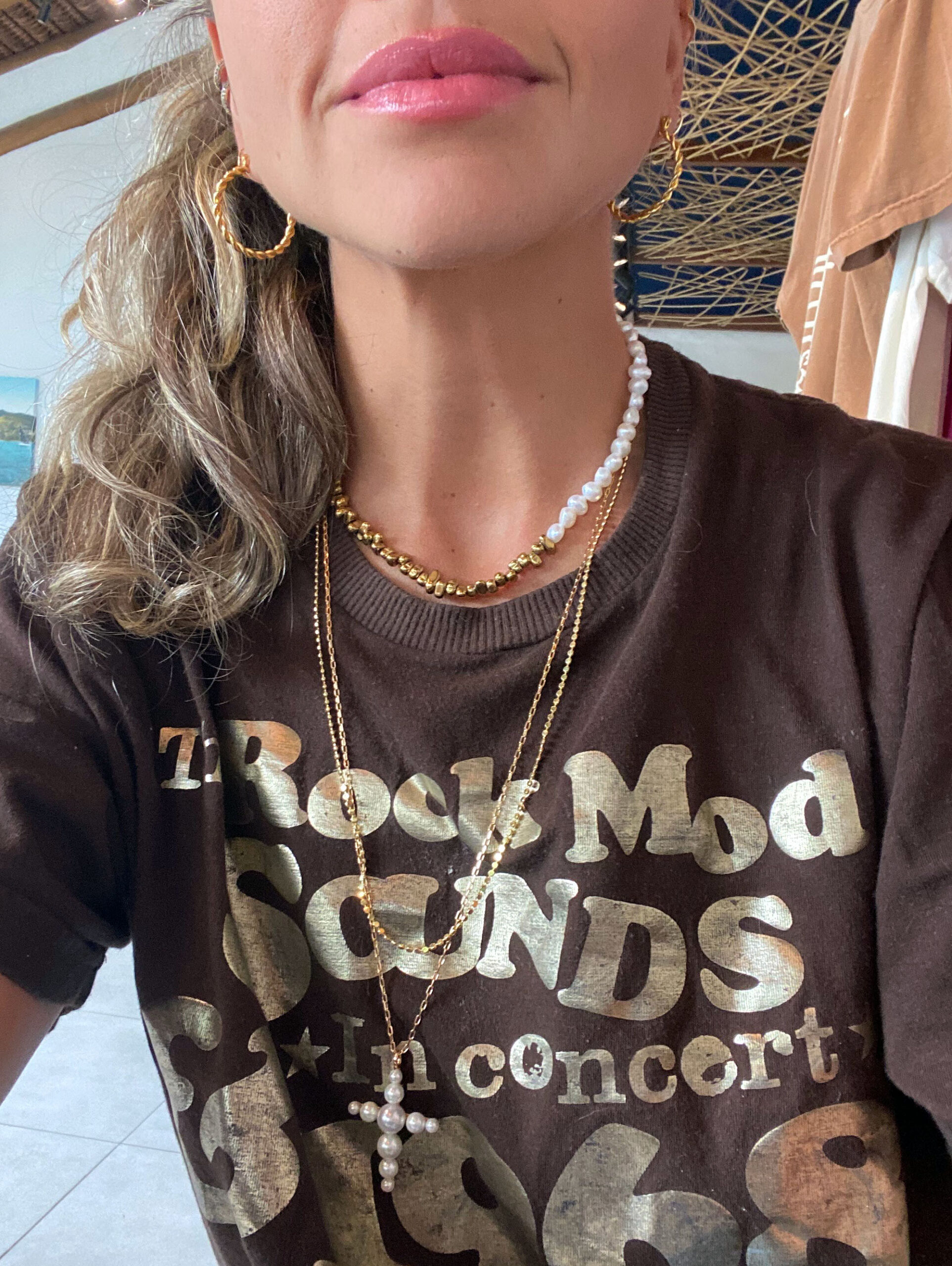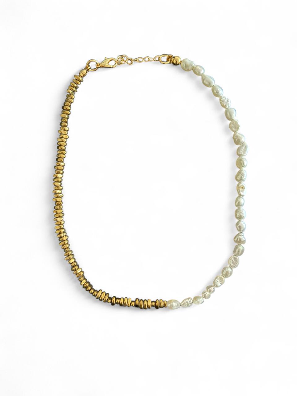 O colar dueto é puro charme. Metade de cascalho de hematita e metade pérola de água doce. Ele combina com qualquer look e vai bem e todas as ocasiões. O queridinho pra chamar de seu!